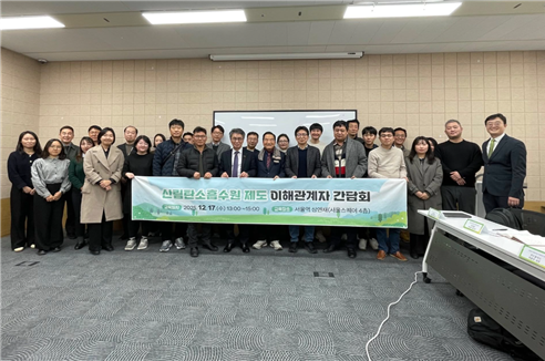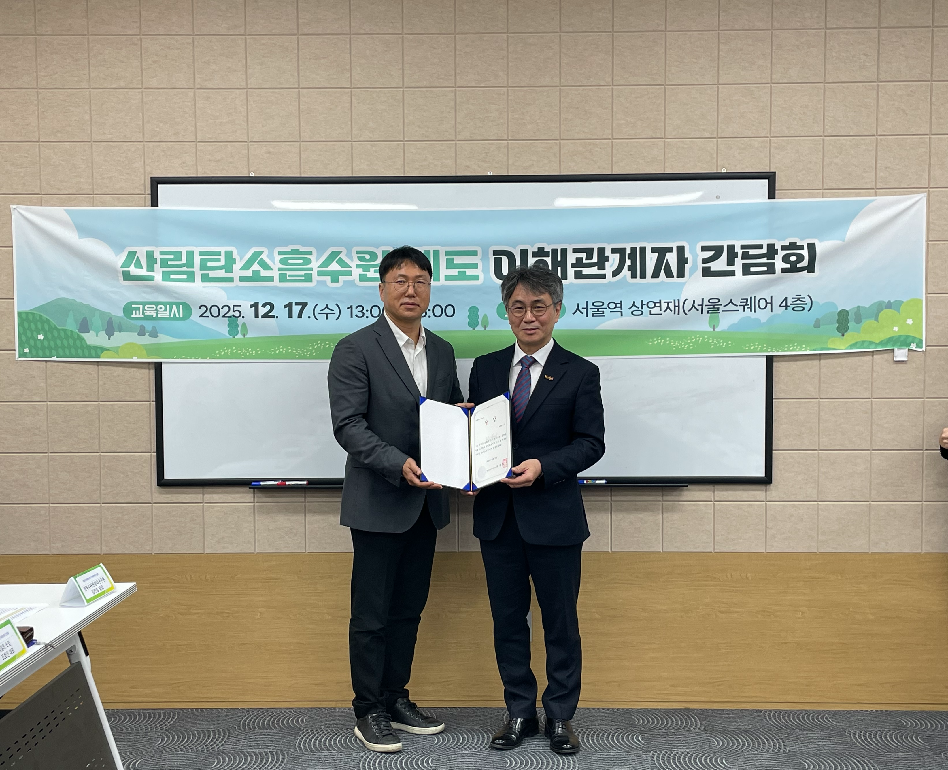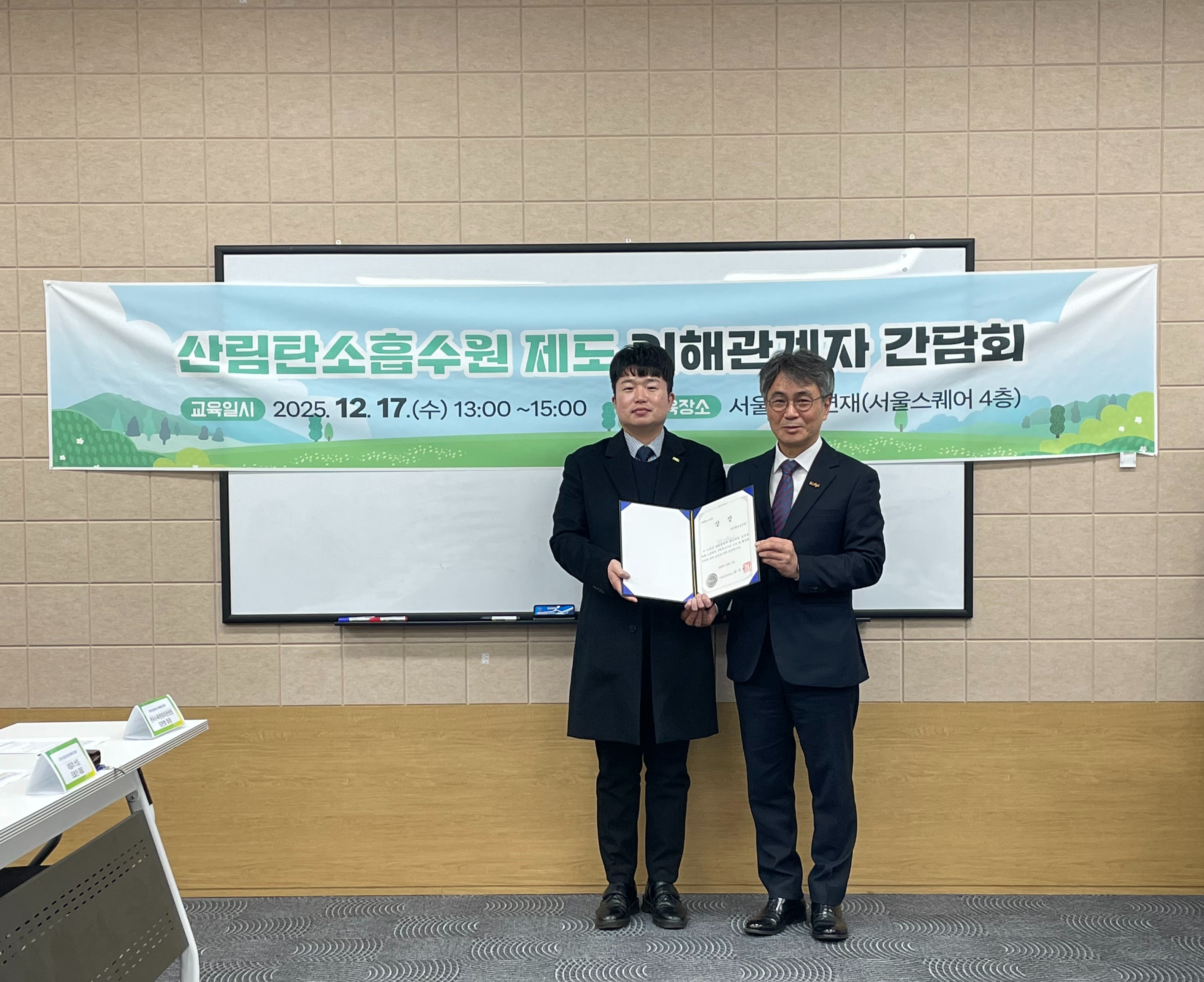 12월 17일, 산림탄소흡수원 이해관계자 간담회가 개최되었어요. 산림부분 배출권거래제 외부사업, 산림탄소상쇄제도의 핵심 이해관계자인 사업자(산주), 컨설팅사, MRV기업, 시장참여기업 등 약 30명이 참석한 가운데, 에코매스(주)와 한국환경보전원에게 감사표창이 수여되었어요. 산림탄소크레딧을 활용하여 자사의 온실가스 배출량을 상쇄하며 탄소중립을 실천하며, 산림기후산업에도 기여한 공로예요. 올해는 두 기관의 참여와 함께, 약 7천 5백톤(작년 대비 20% 상승)의 산림탄소흡수량이 거래되었답니다!